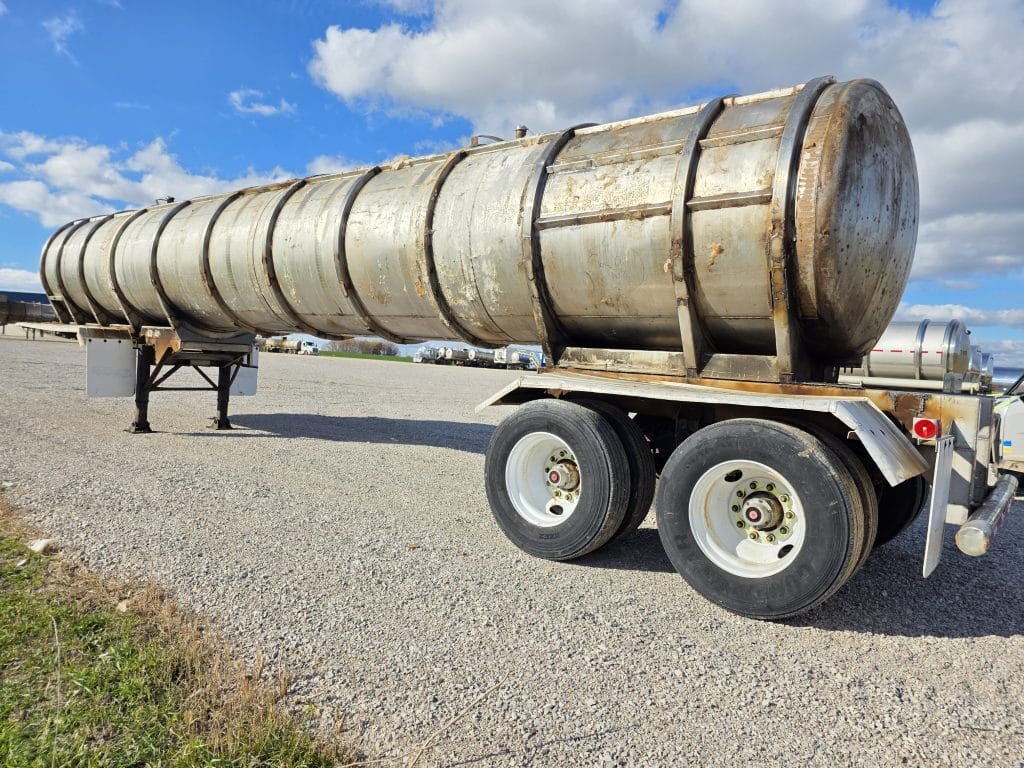 7000 Gallon Stainless Steel Straight Barrel Semi Tanker, Rear Unload, Stainless Steel Landing & Running Gear, 8 Leaf Suspension, 8 Straight Hole Wheels, 275/80R22.5 **Tanker is Stripped of outer sheeting, air lines and electrical. getting setup as a rapid unload tank. **