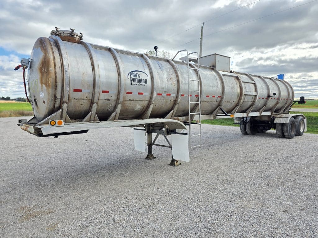 7000 Gallon Stainless Steel Straight Barrel Semi Tanker, Rear Unload, Stainless Steel Landing & Running Gear, 8 Leaf Suspension, 80% Brakes, 80% Tires, 8 Straight Hole Alum Wheels275/80R22.5, Outboard Brake Drums.