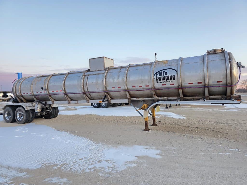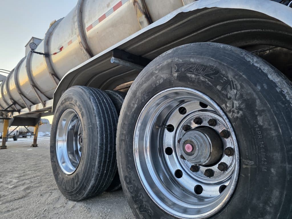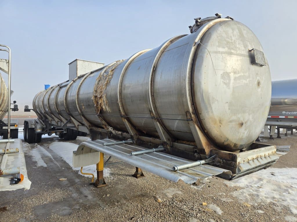 7000 Gallon Stainless Steel Straight Barrel Semi Tanker, Rear Unload, Stainless Steel Landing & Running Gear, 8 Leaf Suspension, 70% Brakes, 80% Tires, 8 Budd Style Wheels 11R22.5, Outboard Brake Drums