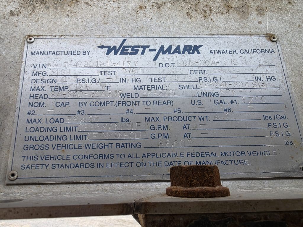 U-4838 2001 West Mark 6700 Gallon Stainless Steel Semi Tanker