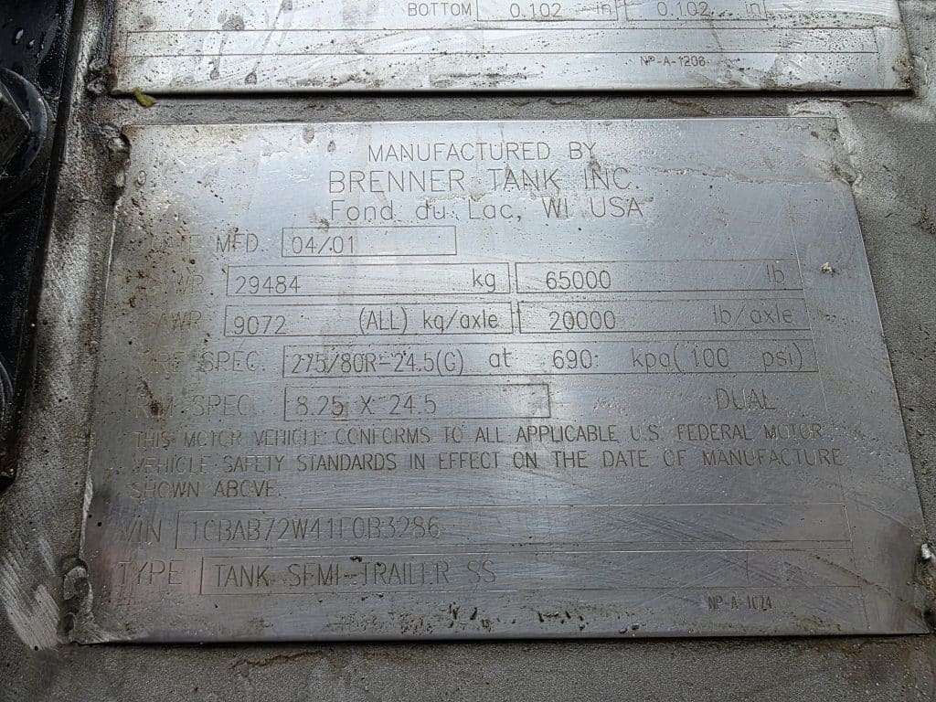 U-4839 2001 Brenner 7200 Gallon Stainless Steel Semi Tanker