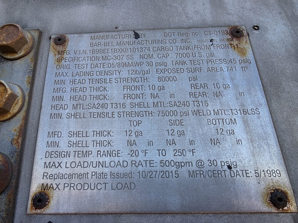 U-4848 1989 Bar-Bel 7000 Gallon Stainless Steel Semi Tanker