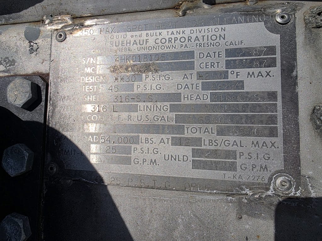 U-4858 1987 Fruehauf 6500 Gallon Stainless Steel Semi Tanker
