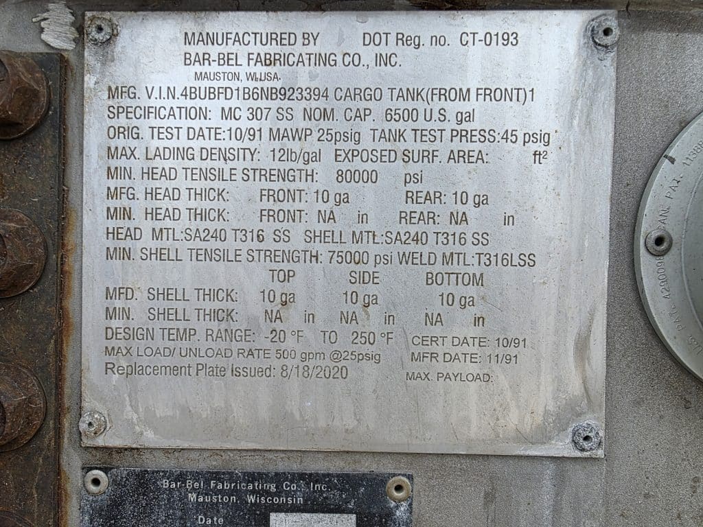 6500 Gallon Stainless Steel Straight Barrel Semi Tanker, Rear Unload, Steel Landing & Stainless Running Gear, 2 Leaf Suspension, 70% Brakes, 70% Tires, Outboard Brake Drums, Straight Hole Wheels, 11R22.5